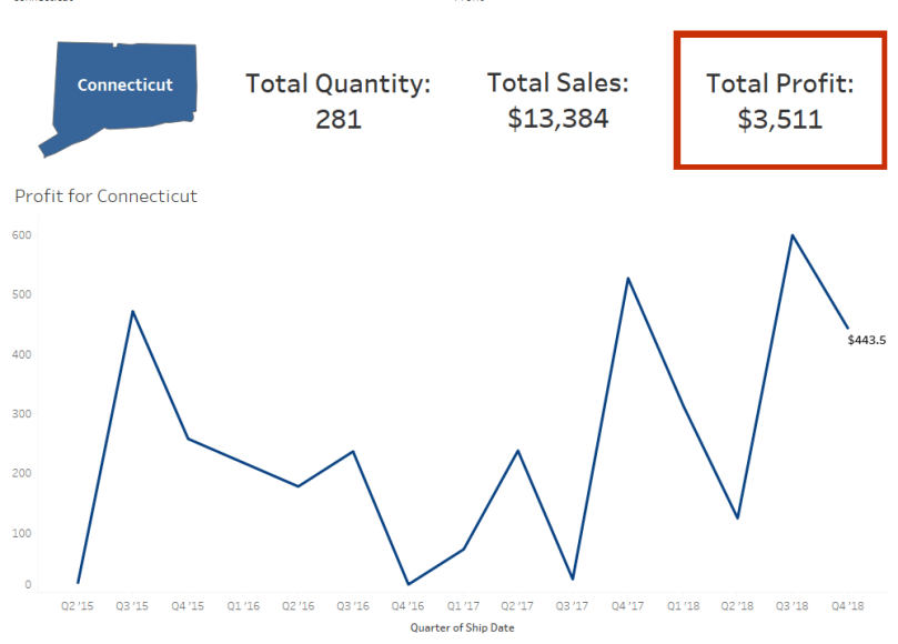 - Create your BANs (“Big Ass Numbers”) and other graphs that will be filtered based on the dimension or measure (depending) in your BANs. In my example, I have summary BANs for three measures: quantity, sales, and profit. My line graph then shows just one of those measures.