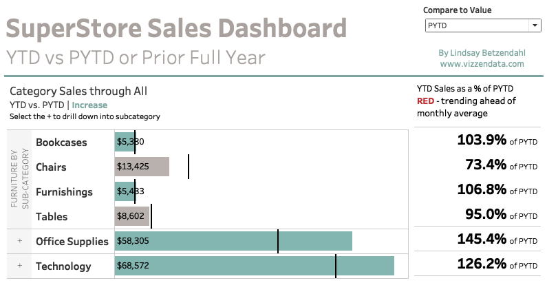 The resulting viz looks like this, below, where you can see that even though when comparing the current YTD to the prior full year for supplies, for example, sales is obviously lower, I can now see in the percent to the prior year that supplies is possibly projected to be higher than last year since after 4 months, it already had 48% of the of the sales from all of the prior year.