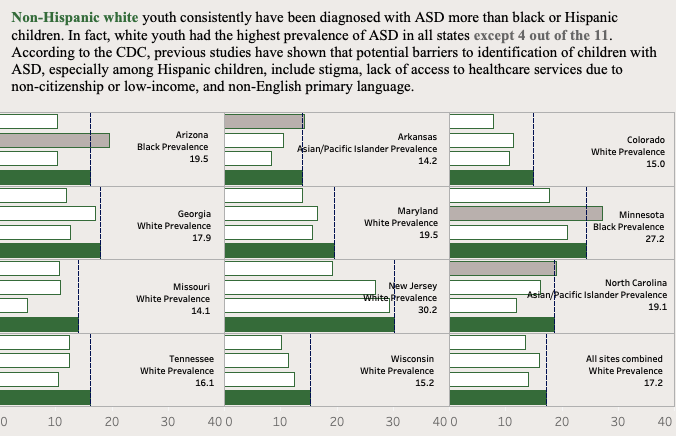 I should mention, the reason for this decision is that ASD is more prevalence among whites than other racial or ethnic groups nationwide. However, I noticed that in this sample data, there were some instances where this wasn’t the case and I wanted to highlight this.