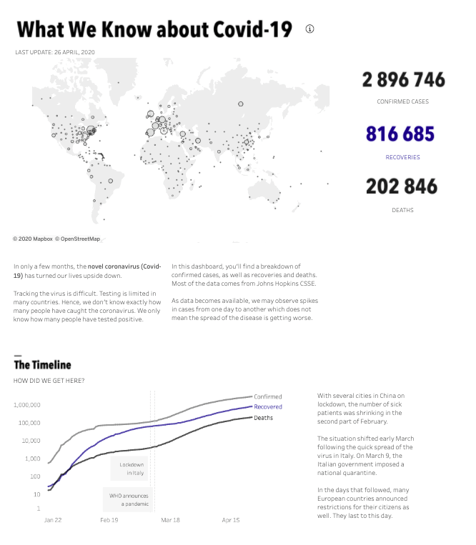 Additionally, Tableau has a COVID Viz Gallery in which a large number of great visualizations can be explored. I encourage you to check it out if you haven’t already.