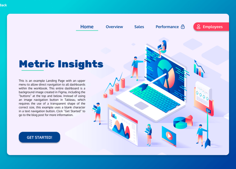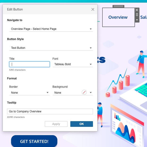 Now you have a blank navigation button that you can use on your dashboard. One tip, I like you create menu bars and use vertical containers to house my various navigation buttons. In the example workbook, I provide two dashboard pages: Home and Overview. The Home page is the main landing page with one large background image and the Overview page has just a header image. The navigation buttons typically would be in that vertical container on top of the text in the image.