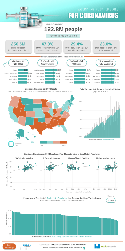 With various COVID vaccines now becoming available around the world, many organizations and individuals have created data trackers, visualizations, and dashboards. In a collaboration created with the help of the Tableau Foundation, Urban Institute and HealthDataViz worked together to create a visualization on the vaccination progress in the United States. The Tableau dashboard looks at not just trends in vaccination rates, but also where those vaccines are available and how that distribution intersects with sociodemographic information such as percent of people of color and percent of people working in different sectors.