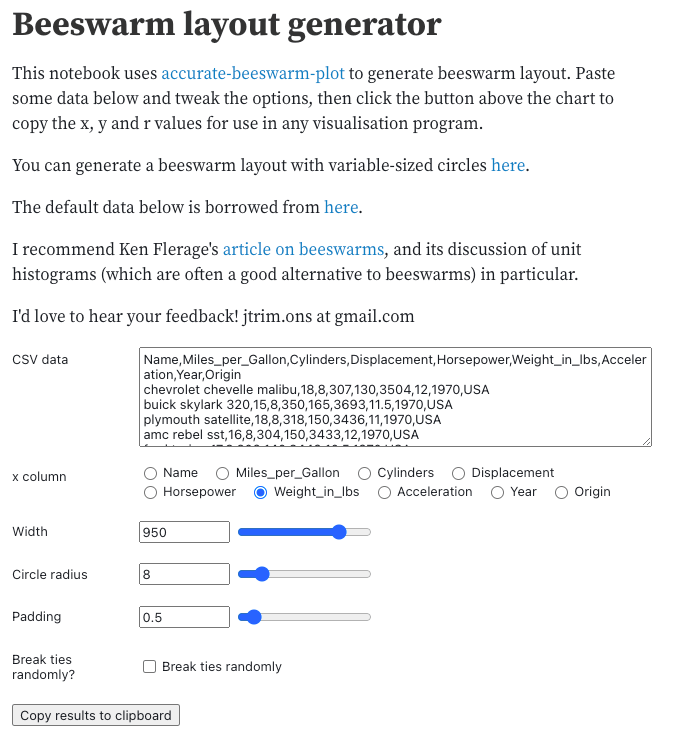 Single-sized circles: https://observablehq.com/@jtrim-ons/beeswarm-layout-generator/2