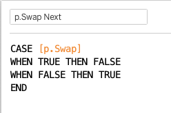 I then hooked up the parameter using a swap technique (also discussed in my Top 10 Tricks to Intensify Your Business Dashboards presentation). For this, I created a p.Swap calculation (just has the parameter field in it) and a p.Swap Next calculation. In a new worksheet, I put p.Swap and p.Swap Next on details and set the mark to a blank shape (if you want different shapes, you can put the p.Swap on shapes too).