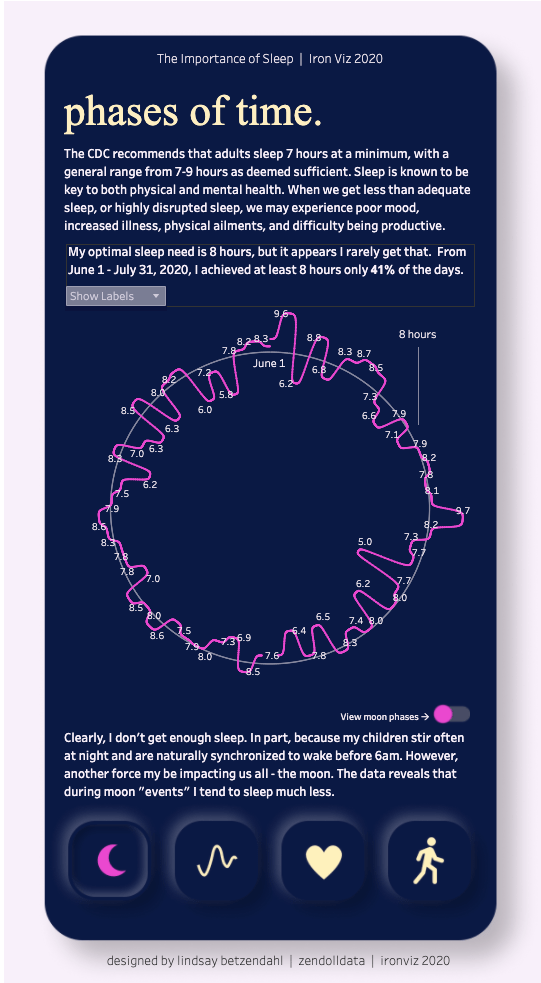 I’ve been collecting my sleep data for the past year ever since I received an Amazon Halo tracker for Christmas 2020. I’ve always been interested in sleep. In fact, my Iron Viz for 2020 (prior to receiving my Halo) was on sleep. I collected data for 2 months on my sleep time using an old tracker I had, but the process of retrieving the data was manual as I couldn’t export it.