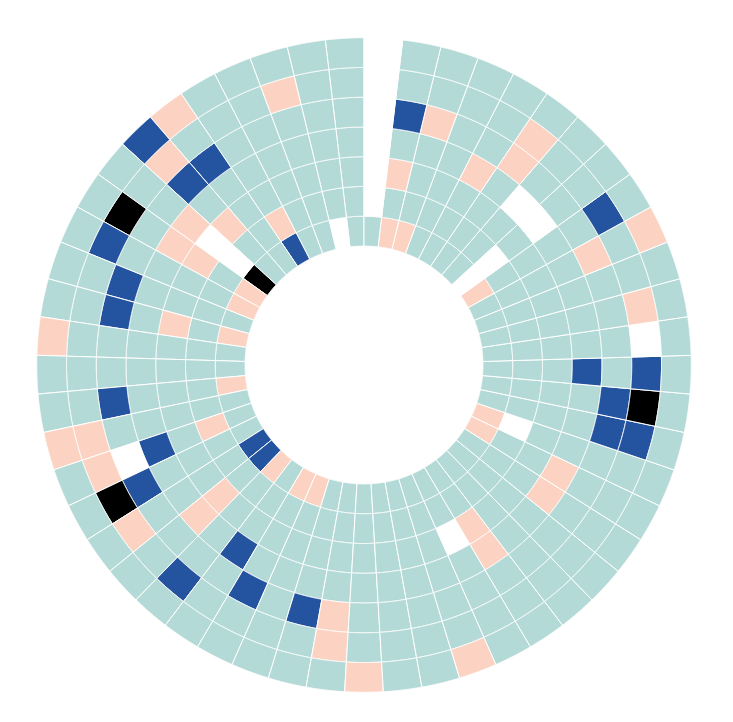 Christian utilized Zen Master Ken Flerlage‘s sunburst template to get started. Ken’s template can be used for any type of sunburst and gives you some flexibility to even change the width of each ring or separate them apart with padding. This could have been useful for my organizational hierarchy I did back in 2017. However, I didn’t need that level of detail because I needed each ring to be the same size without padding to replicate a calendar. So I took Ken’s template and modified it just slightly to accommodate my needs. Then I just added in my data and viola! I had my sunburst.