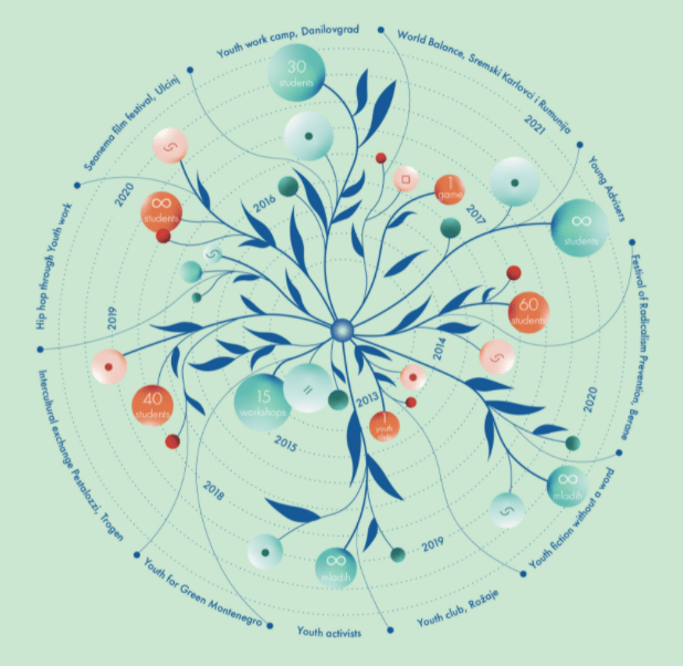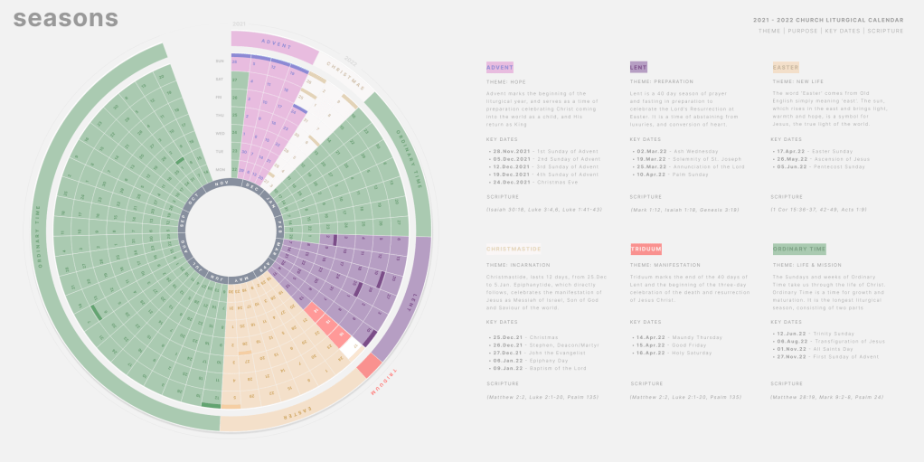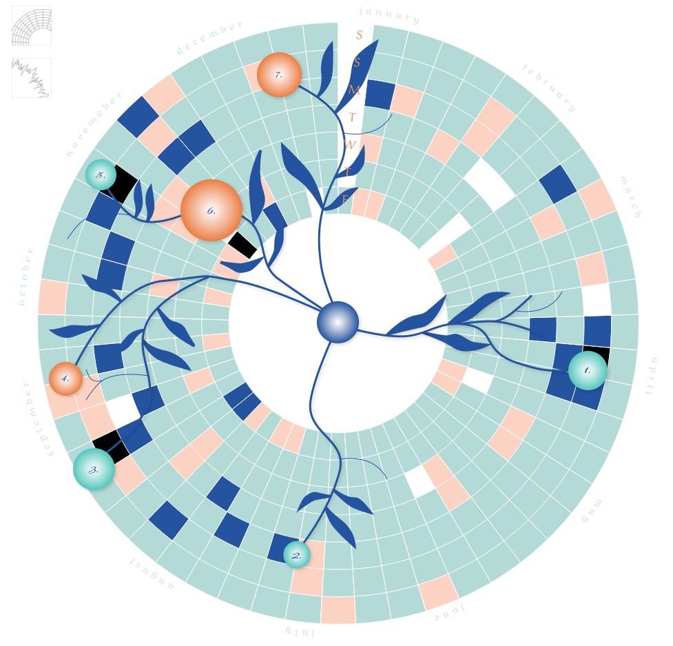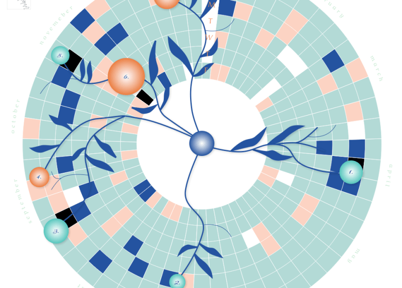 To finish up the viz, I was inspired by an image I came across on Behance. This gave me the idea to layer in some key dates over the sunburst. Using Figma, I created some flower-like illustrations and bubbles similar to the image below. I also utilized colors from this image in my viz as they really felt calming. Note that I had searched a lot for colors to use that represented “sleep” but none felt right. It wasn’t until I saw this image that I felt a sense of calmness and peace that seemed to represent the concept of sleep for me. Using the Arc plug-in in Figma, I was able to create the months around the sunburst and add in the details as mentioned.